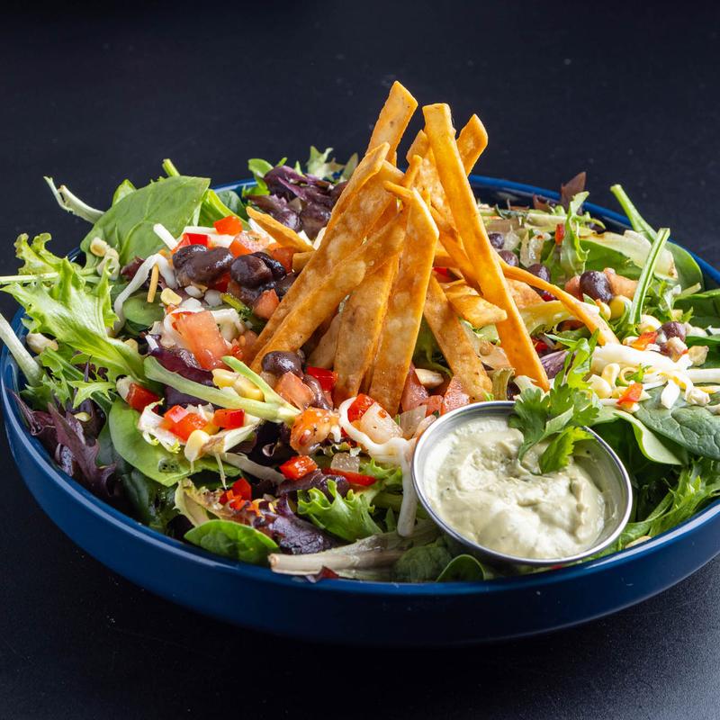 Mixed greens tossed with black beans, corn, red peppers, pico de gallo, mixed cheese, and avocado crema. Topped with fresh crispy tortilla strips.