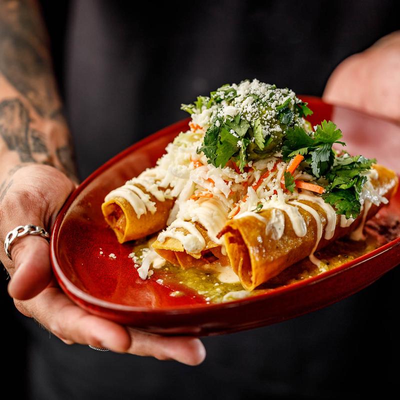 Crispy rolled taquitos served over a bed of lettuce topped with pico de gallo, sour cream, guacamole, queso cotija, and fresh cilantro.