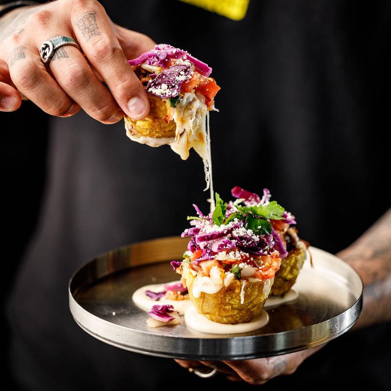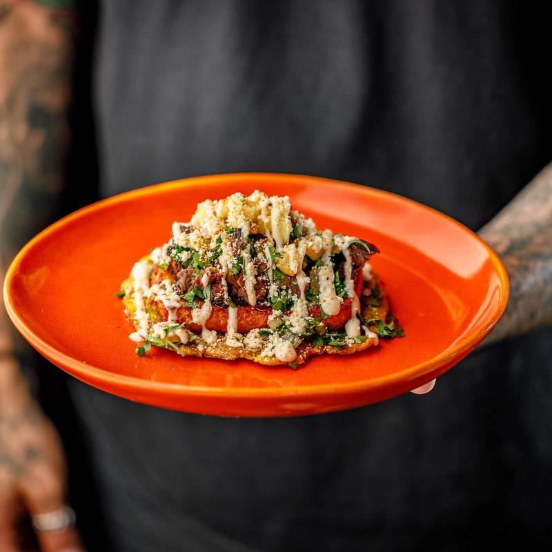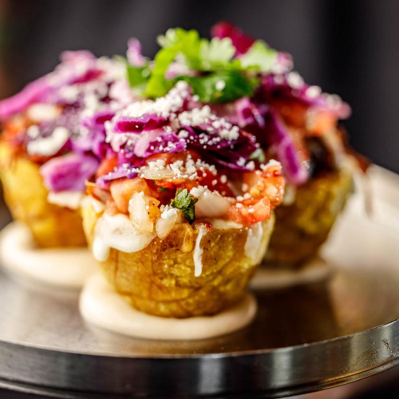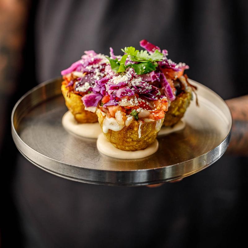 Plantain cups topped with melted cheese, pico de gallo, pickled cabbage, queso cotija, sauce & protein of your choice.
